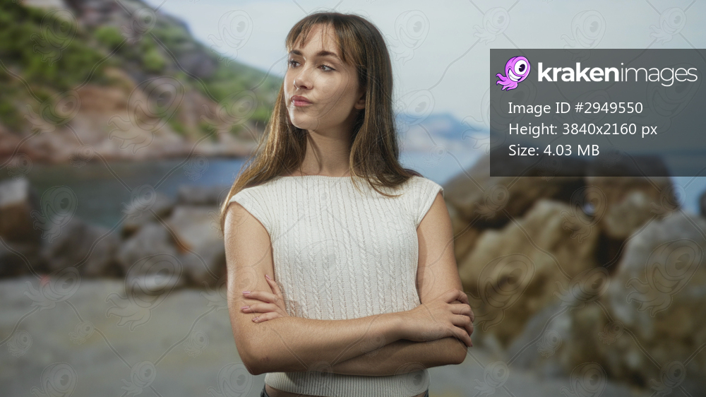 Young woman arms crossed at rocky seaside on street with neutral expression; quiet confidence independence.