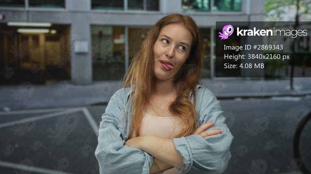 Young woman arms crossed gesture in front of modern office building on downtown street; playfulness mischief confidence defiance.