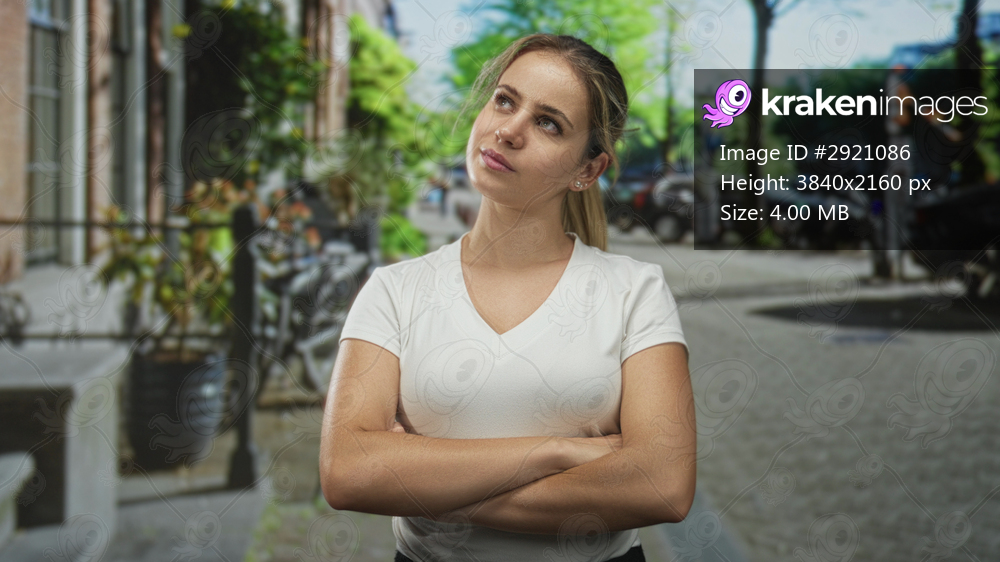 Young woman with arms crossed on city street wearing white v neck t shirt, head tilted and eyes closed looking away; rejection.