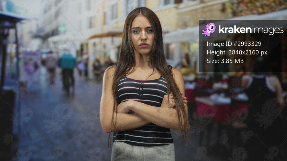 Young woman with arms crossed showing bare forearms and long hair, wearing a striped tank top, standing in a busy cobblestone street cafe; defiance.
