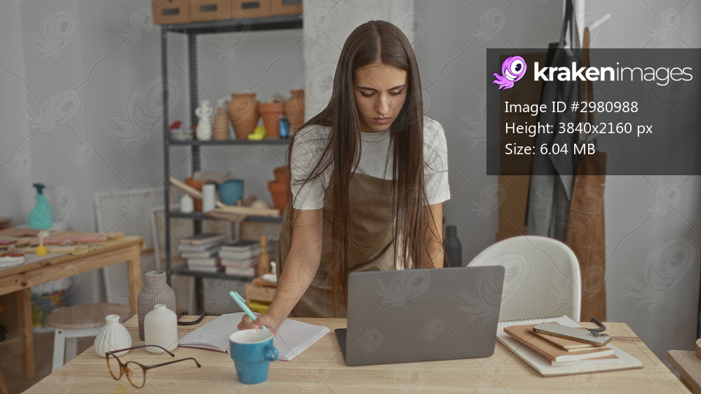 Young woman artisan leaning over a wooden table, pen in hand and laptop open while reaching for a blue mug in a pottery studio; quiet concentration.
