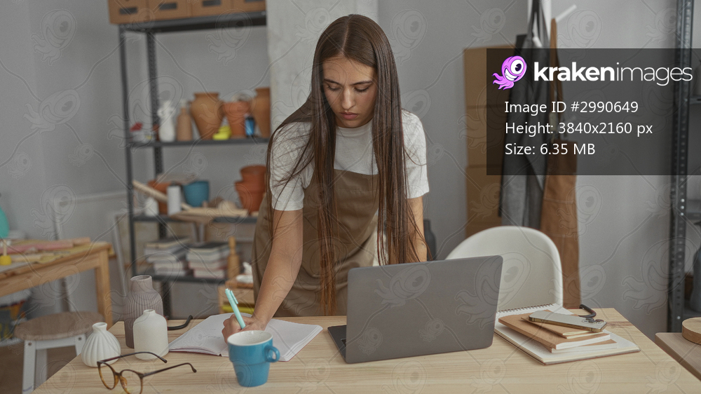 Young woman artisan leaning over a wooden table, pen in hand and laptop open while reaching for a blue mug in a pottery studio; quiet concentration.