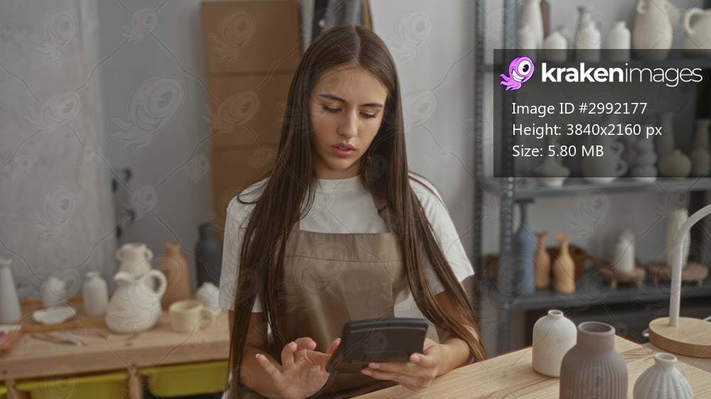 Young woman artisan taps a handheld calculator with fingers in a pottery studio at a wooden workbench, surrounded by shelves of vases; concentration planning. - Kraken Images