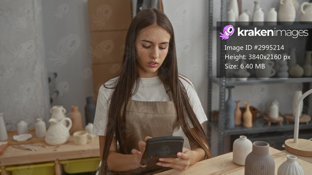 Young woman artisan taps a handheld calculator with fingers in a pottery studio at a wooden workbench, surrounded by shelves of vases; concentration planning. - Kraken Images