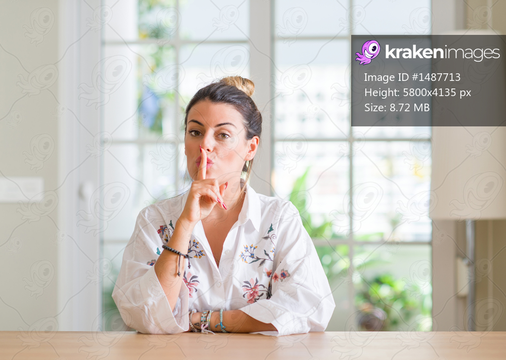 Young woman at home asking to be quiet with finger on lips. Silence and secret concept.
