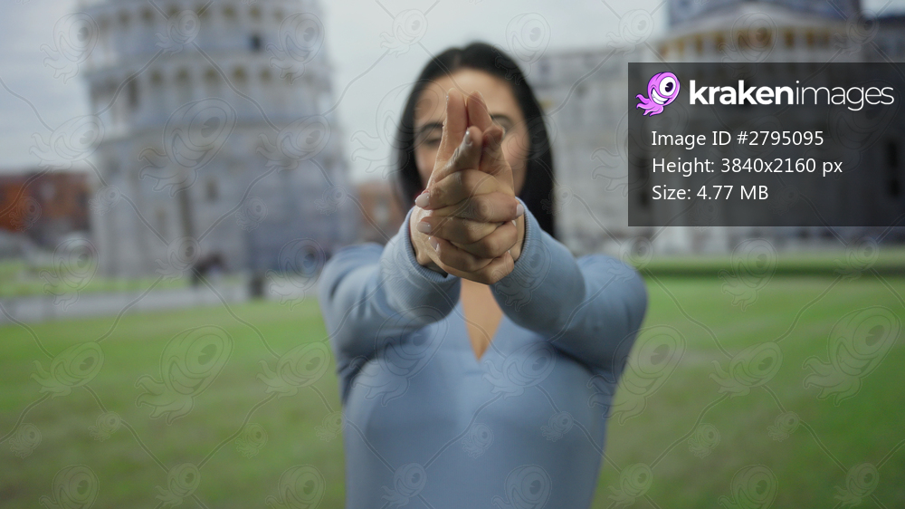 Young woman at pisa tower doing finger gun gesture outdoors showcasing playful moment with iconic italian landmark in the background.