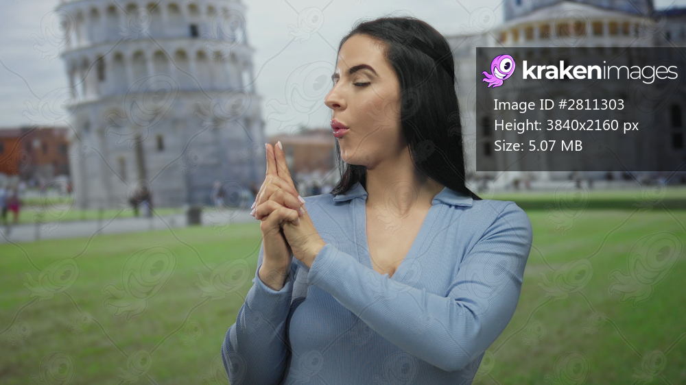 Young woman at pisa tower doing finger gun gesture outdoors showcasing playful moment with iconic italian landmark in the background.