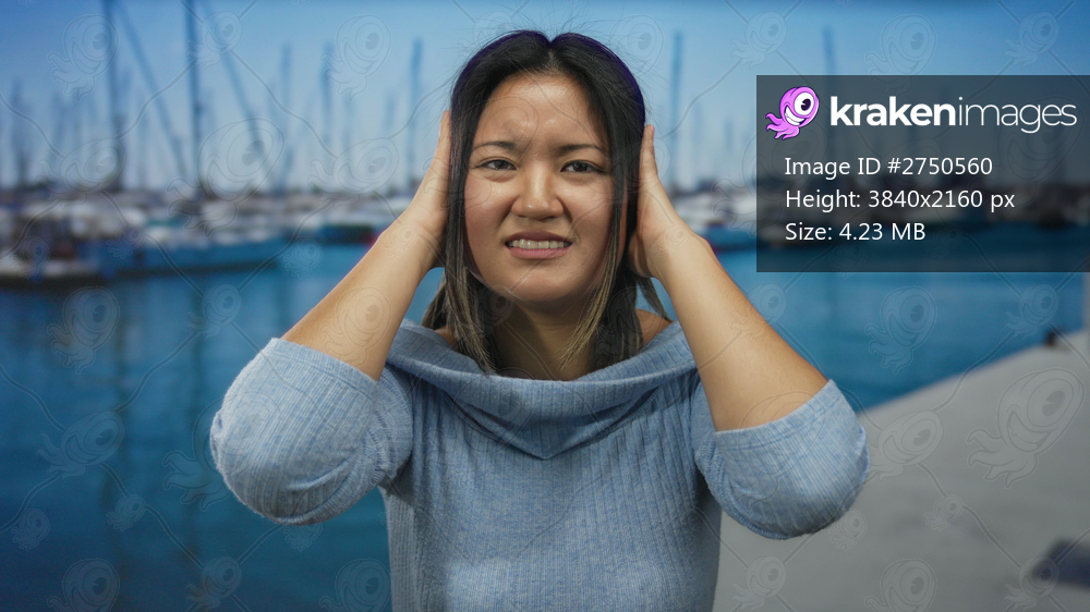 Young woman at seaside port covering her ears with a backdrop of boats and a calm sea capturing a moment of introspection and tranquility.