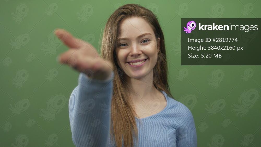 Young woman with auburn hair offers open hand in green studio setting; trust invitation connection warmth.