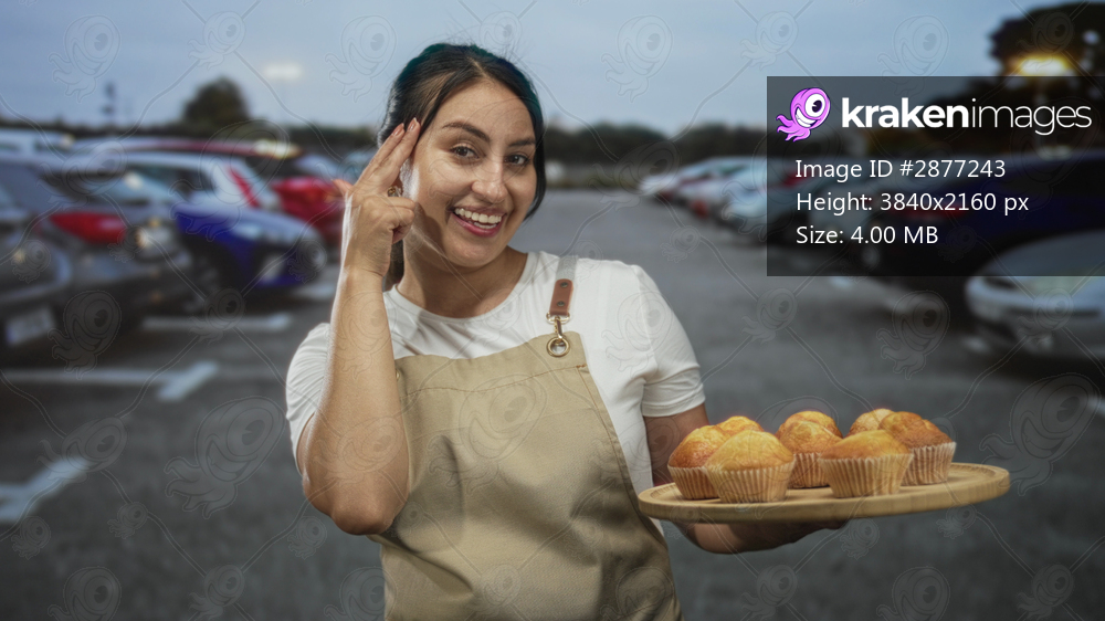 Young woman baker in apron holding a wooden tray of muffins and points finger to head in a street parking lot with cars; cheerful hospitality.