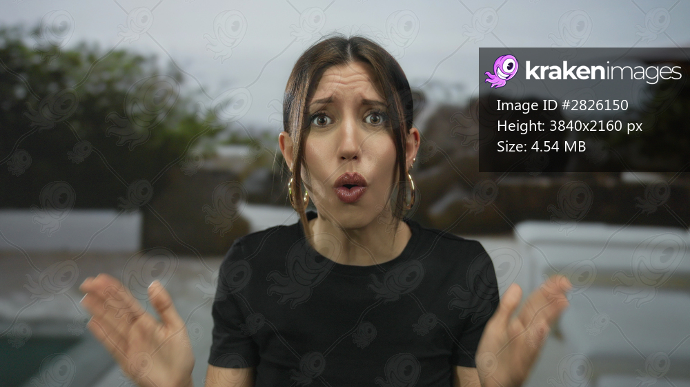 Young woman with bare hands beside cheeks and puckered lips against building facade outdoors; surprise.