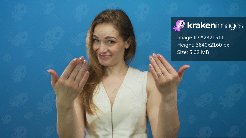 Young woman beckoning with extended hands in front of a bright blue studio wall; invitation welcome.