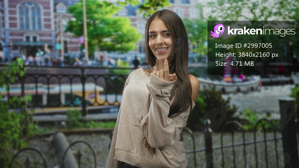 Young woman with beckoning finger by a canal wearing an off shoulder sweater and visible braces; playful confidence.