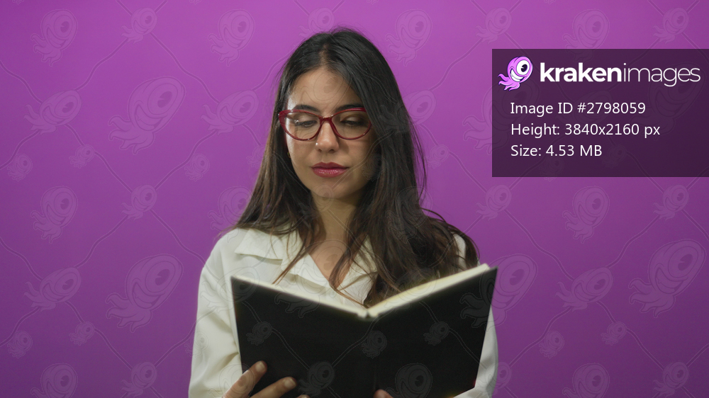 Young woman beckons with finger while holding open book in studio setting with pink walls; invitation.