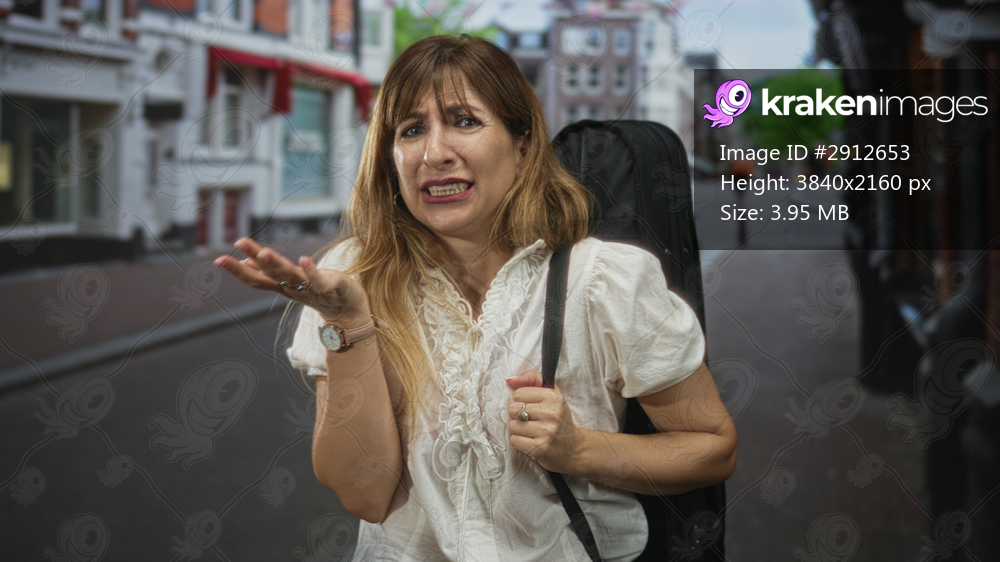 Young woman biting fingernail while clutching guitar case strap on narrow city street between buildings; nervousness travel.