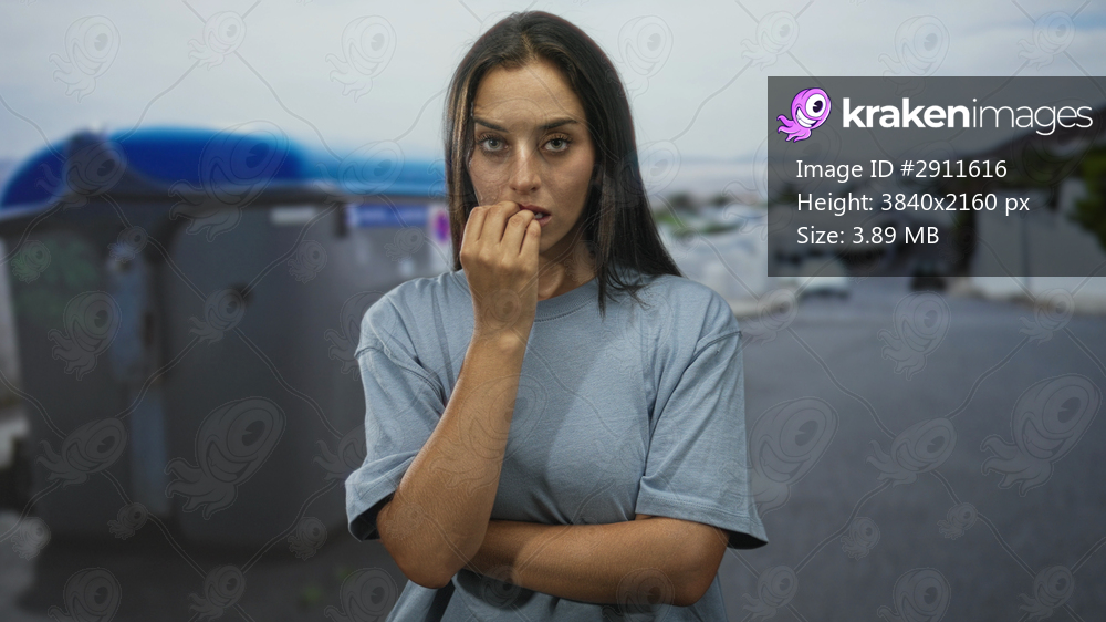 Young woman biting nails, hand to mouth, standing by recycling container and trash bin on street; nervousness vulnerability.