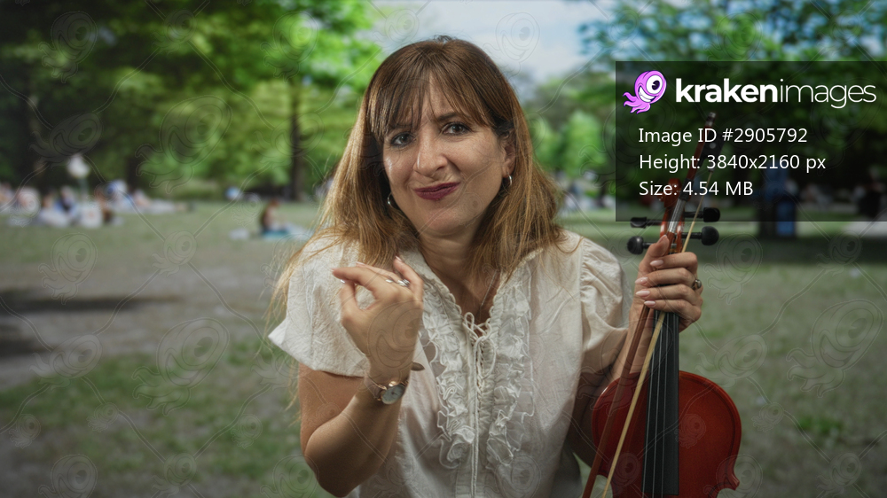 Young woman biting nails while holding violin and bow in green park, fingers at mouth and gripping instrument; nervousness performance concern.