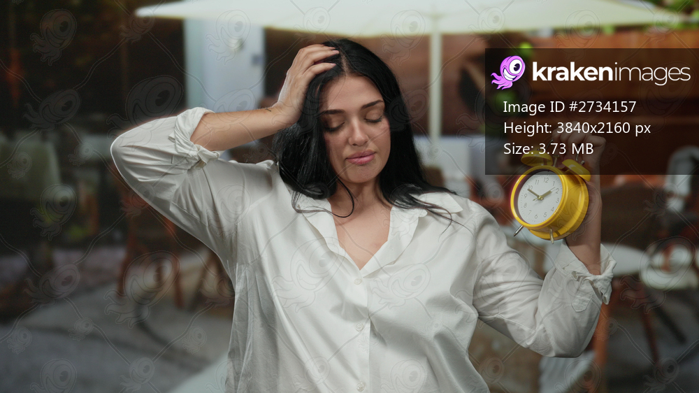Young woman with black hair holding yellow alarm clock on an outdoor restaurant terrace, wearing white shirt in a casual setting, feeling tired.