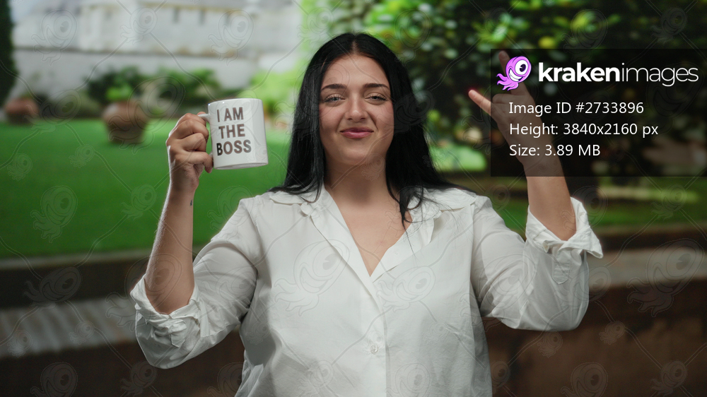 Young woman with black hair in white shirt holding boss mug making rock gesture in a green park setting showing confidence and empowerment outdoors.