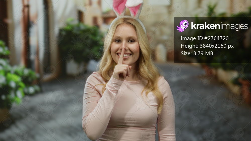 Young woman with blonde hair and bunny ears playfully gestures for silence on a vibrant city street with blurred greenery in the background outdoors on a sunny day - Kraken Images