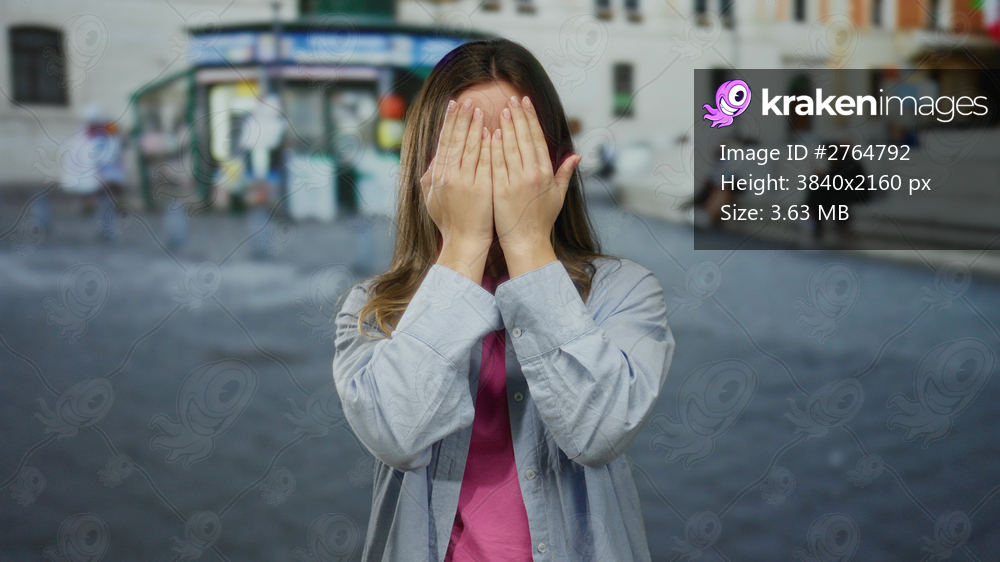 Young woman with blonde hair covers face playfully on a busy street, wearing casual clothes, conveying emotions in an urban outdoor setting with blurred background. - Kraken Images