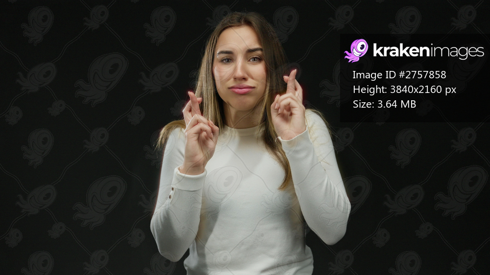 Young woman with blonde hair crossing fingers hopefully against isolated black background in candid portraits.