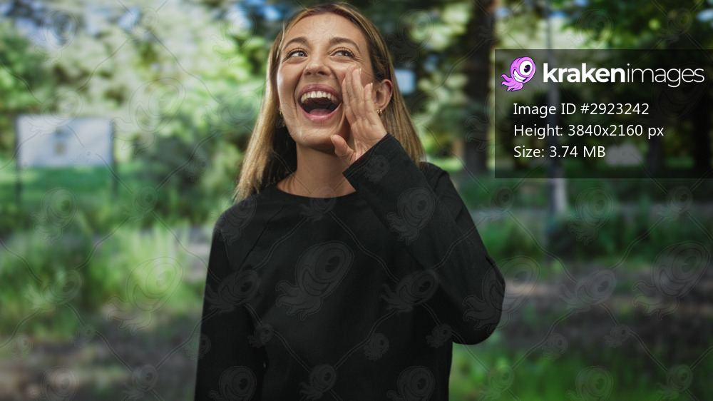 Young woman with blonde hair cupping hands to mouth shouting in forest among green trees and path wearing black top; joy celebration.
