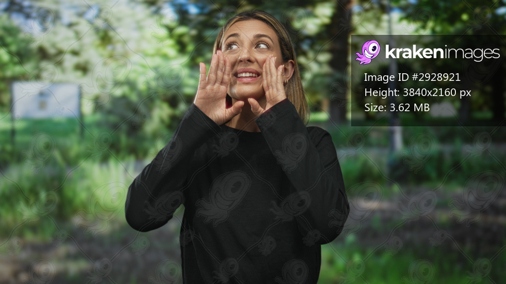 Young woman with blonde hair cupping hands to mouth shouting in forest among green trees and path wearing black top; joy celebration.