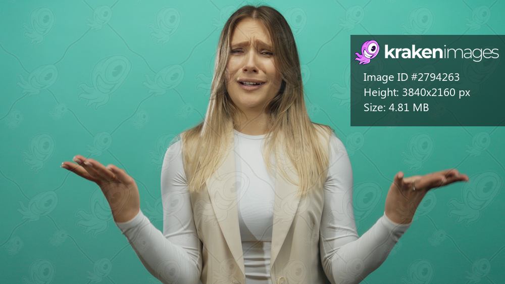 Young woman with blonde hair expressing frustration against a green background wall, conveying emotion with expressive gestures while isolated and looking upwards in a portrait. - Kraken Images