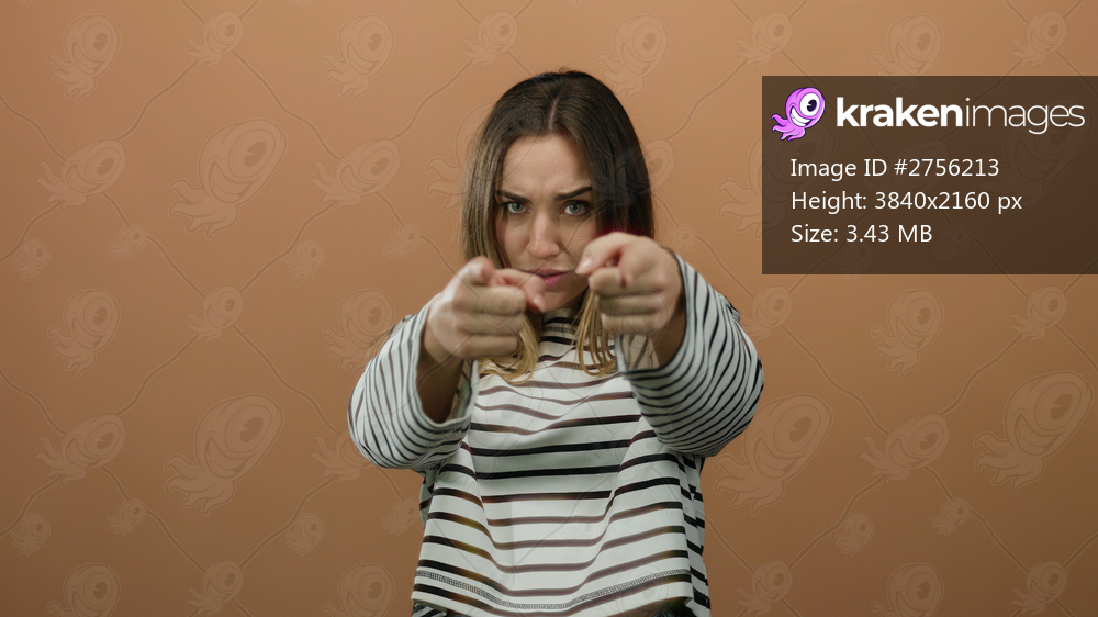 Young woman with blonde hair gestures come here with both hands against a brown wall, wearing a striped shirt, isolated over an inviting isolated background. - Kraken Images