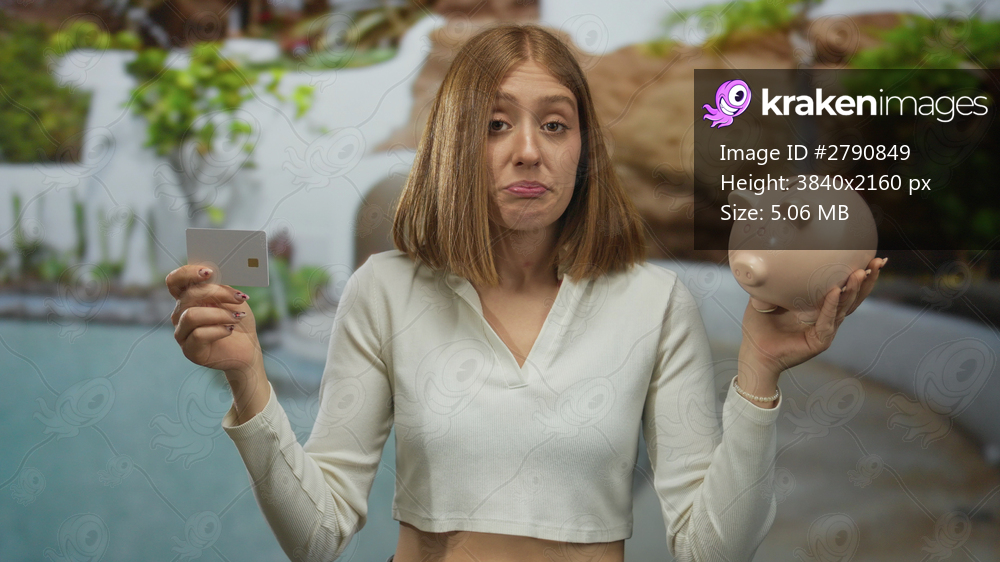 Young woman with blonde hair holding credit card and piggy bank by a pool at a resort, contemplating financial decisions outdoors.