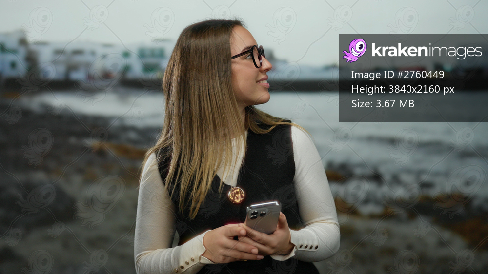 Young woman with blonde hair holding phone, standing outdoors near seaside with surprised expression, wearing glasses and stylish outfit while looking away at the beach background scenery. - Kraken Images