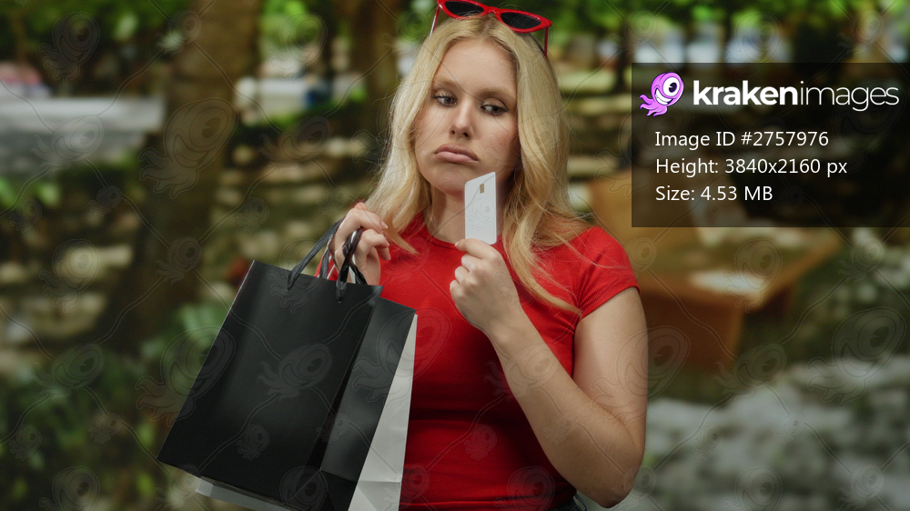 Young woman with blonde hair holding shopping bags and a credit card in a park with green trees wearing red top and sunglasses looking thoughtful outdoors. - Kraken Images