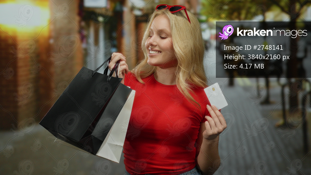 Young woman with blonde hair holding shopping bags and credit card smiles confidently while standing on an urban street, wearing red shirt and sunglasses outdoors. - Kraken Images