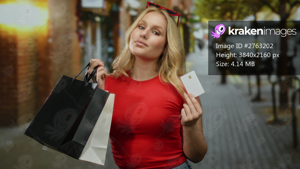 Young woman with blonde hair holding shopping bags and credit card smiles confidently while standing on an urban street, wearing red shirt and sunglasses outdoors. - Kraken Images