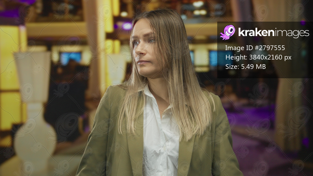Young woman with blonde hair in a hotel lobby wearing a blazer, captured indoors under warm lighting, conveying a serene atmosphere, ideal for business or travel themes. - Kraken Images
