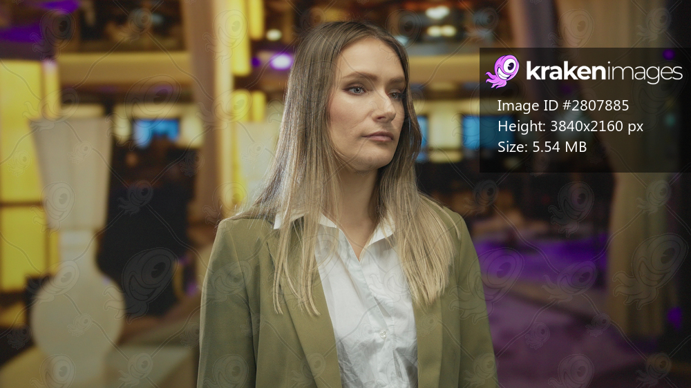 Young woman with blonde hair in a hotel lobby wearing a blazer, captured indoors under warm lighting, conveying a serene atmosphere, ideal for business or travel themes. - Kraken Images