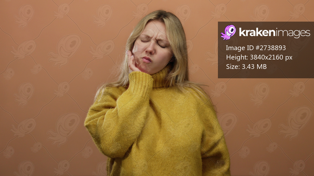 Young woman with blonde hair in a yellow sweater grimaces in pain while touching her cheek against a brown wall background, suggesting a dental issue or headache. - Kraken Images