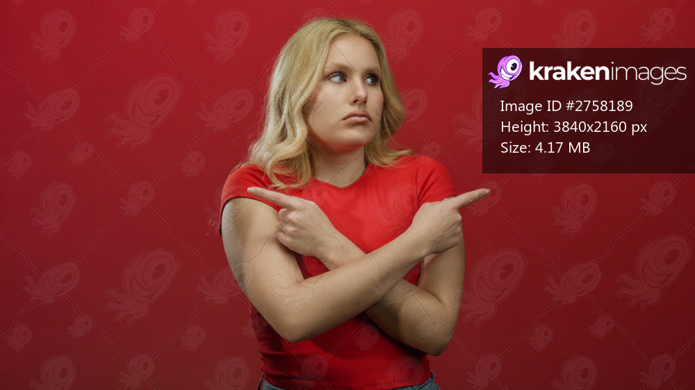 Young woman with blonde hair in red shirt gestures against a vibrant red background, conveying direction and decision.