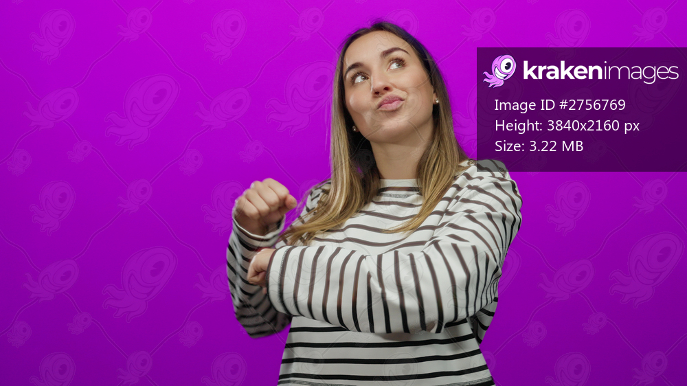 Young woman with blonde hair in striped shirt dancing playfully over isolated pink background adding vibrant energy and cheerful expression