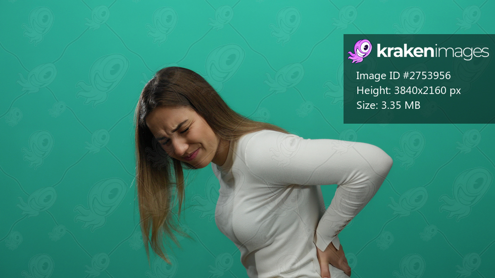 Young woman with blonde hair looks distressed holding her back against an isolated green background wall, implying discomfort or pain.