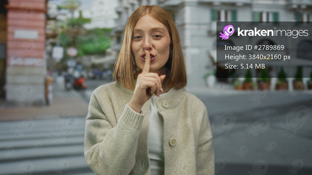 Young woman with blonde hair making quiet gesture with finger to lips on an urban street; blurred cityscape background conveys a city vibe.