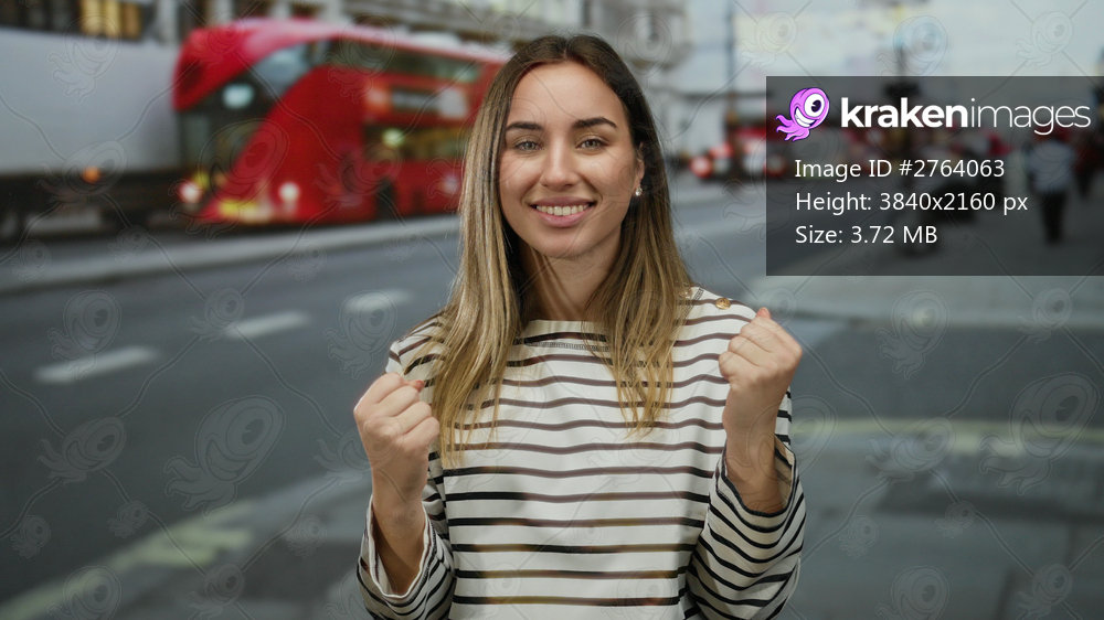 Young woman with blonde hair on a bustling street with red buses, showcasing a lively urban outdoor scene with iconic city vibes and casual fashion.