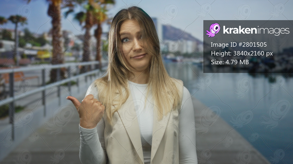 Young woman with blonde hair points sideways with thumb at a port setting featuring boats, a sunny seaside and a relaxed outdoor atmosphere.