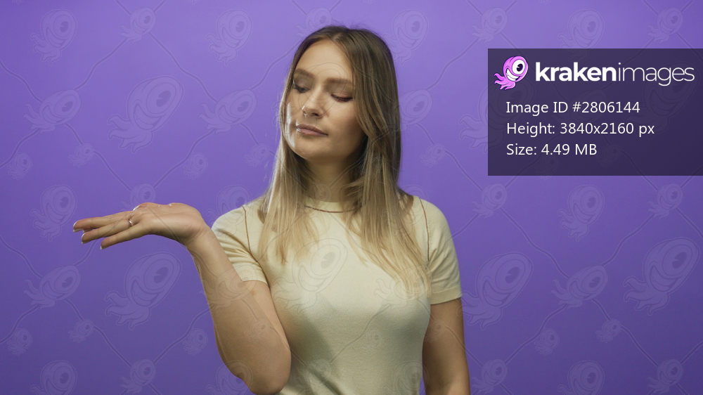 Young woman with blonde hair raises both hands against a vibrant purple background, expressing uncertainty in a casual setting.