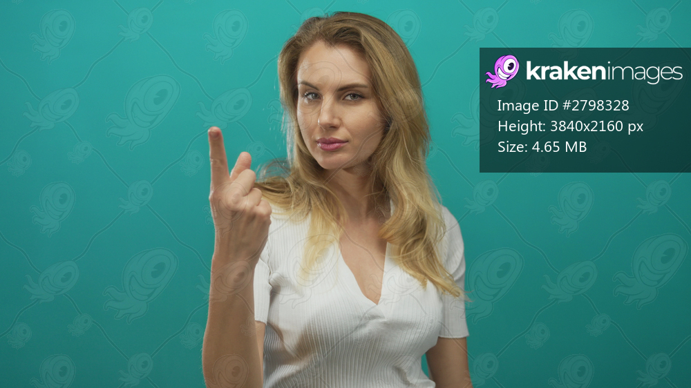 Young woman with blonde hair shows a counting gesture with fingers on a green background celebrating and smiling energetically.