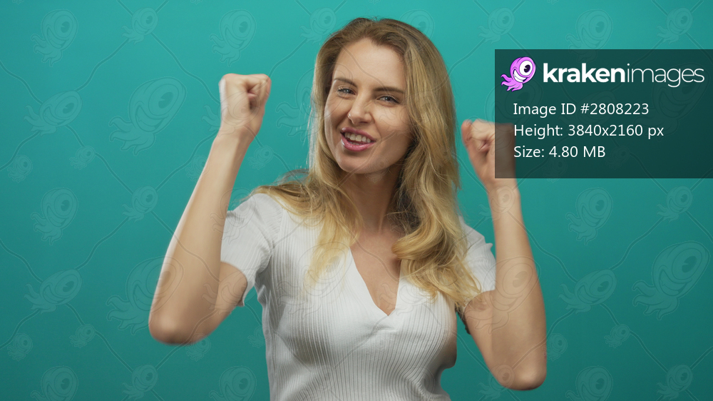 Young woman with blonde hair shows a counting gesture with fingers on a green background celebrating and smiling energetically.