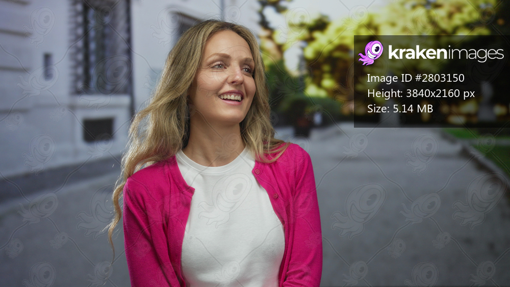 Young woman with blonde hair smiling outdoors on a sunny day in an urban setting wearing a pink sweater and white shirt on a peaceful street.