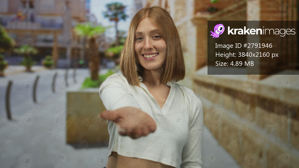 Young woman with blonde hair smiling and reaching out on a sunny urban street with palm trees and stone buildings in the background.