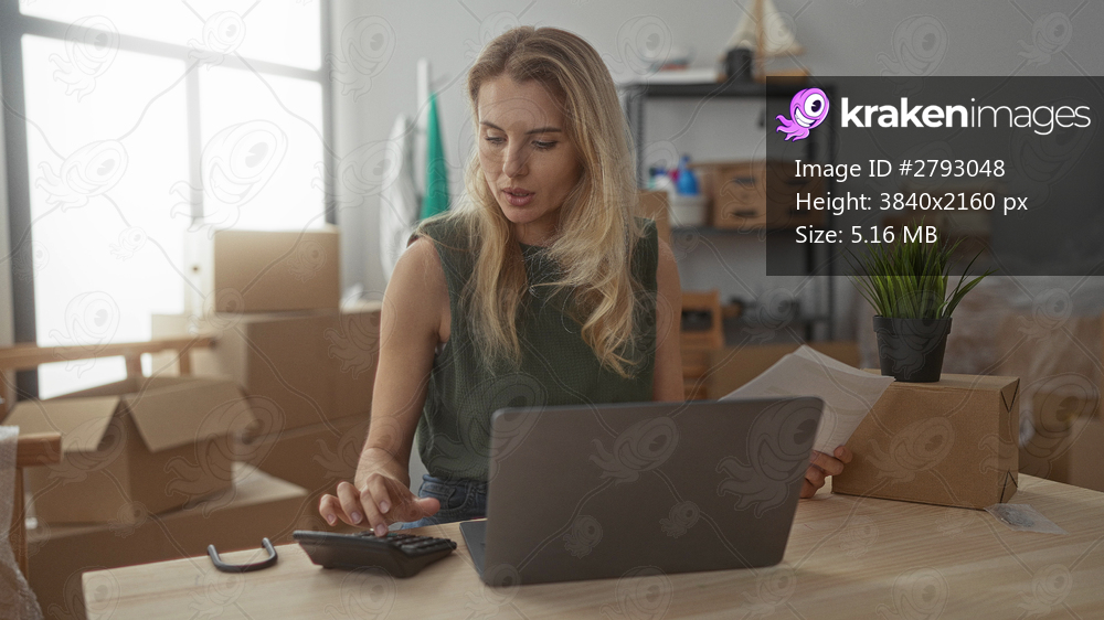 Young woman with blonde hair using a calculator while working on a laptop in her new home surrounded by moving boxes in a living room with interior decor and a potted plant. - Kraken Images
